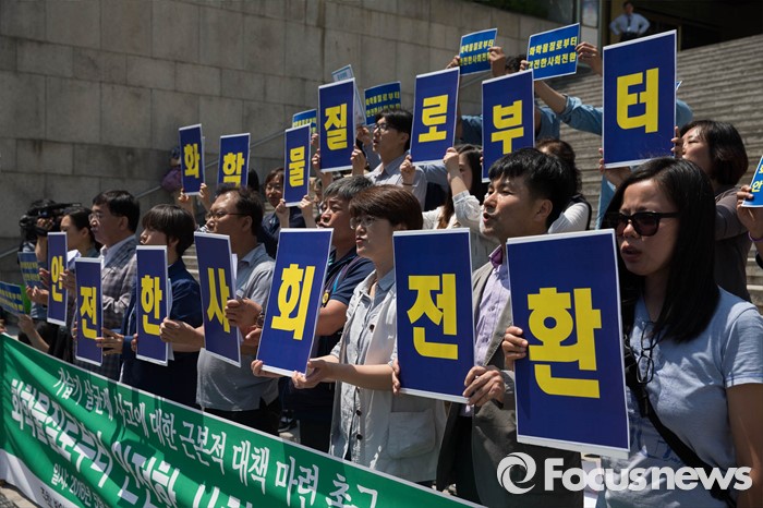 (서울=포커스뉴스) 17일 오전 서울 종로구 세종문화회관 앞에서 환경 및 시민단체와 가습기 살균제 피해자들이 가습기 살균제 사고에 대한 근본적 대책마련을 촉구하며 기자회견을 하고 있다.