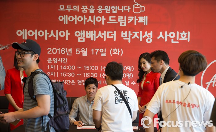 (서울=포커스뉴스) 17일 오후 서울 서대문구 탐앤탐스 신촌로터리점에서 열린 '에어아시아 앰배서더 박지성 사인회'에 참석한 박지성(가운데) 前 국가대표 축구선수 팬들에게 사인을 해주고 있다.