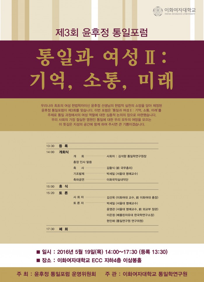 (서울=포커스뉴스) 이화여자대학교가 제3회 윤후정 통일포럼을 개최한다고 17일 밝혔다.