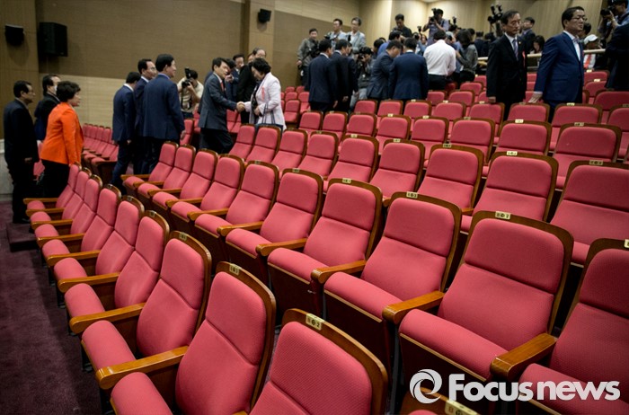 (서울=포커스뉴스) 17일 오후 서울 여의도 국회 의원회관에서 비대위 구성안 및 당헌 당규개정안 등 현안 처리를 위해 예정된 4차 새누리당 전국위원회가 무산된 후 상임고문단 등 참석자들이 퇴장해 빈 자리만 보이고 있다. 이날 전국위원회의는 앞서 예정된 상임전국위원회를 개최해 당헌개정안 등을 심의할 예정이었지만, 친박계 의원들이 대거 불참해 참석자 미달로 회의가 열리지 못 했다.