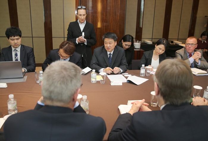 (서울=포커스뉴스) 김학도 산업통상자원부 통상교섭실장이 17일 오후 서울 웨스틴 조선호텔 로즈룸에서 한-EU FTA 발효 5주년 평가를 위해 방한중인 베른트 랑에(Bernd LANGE, 사회당 소속) 유럽의회 국제통상위 의장을 비롯한 8명의 국제통상위 위원의 예방을 받고, 한-EU FTA를 포함한 양측 통상정책과 한국의 향후 FTA 추진방향 등에 관해 의견을 교환하고 있다. <사진제공=산업통상자원부>