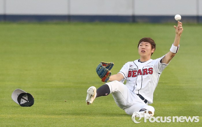 (서울=포커스뉴스) 17일 서울 잠실구장에서 열린 2016프로야구 KIA-두산 경기 2회초 무사 1,3루에서 두산 중견수 정수빈이 KIA 김호령의 뜬공을 슬라이딩하며 잡은후 앉은채로 송구하고 있다.