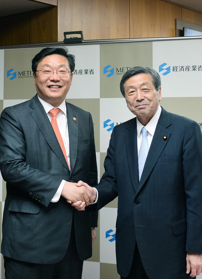 (서울=포커스뉴스) 주형환 산업통상자원부 장관이 17일 오후 일본 동경 경제산업성 집무실에서 하야시 모토오(林幹雄) 경제산업성 대신과 면담에 앞서 악수를 하고 있다. <사진제공=산업통상자원부>
