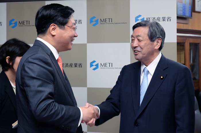 (서울=포커스뉴스) 주형환 산업통상자원부 장관이 17일 오후 일본 동경 경제산업성 집무실에서 하야시 모토오(林幹雄) 경제산업성 대신과 면담에 앞서 악수를 하고 있다. <사진제공=산업통상자원부>