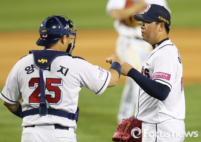 (서울=포커스뉴스) 17일 서울 잠실구장에서 열린 2016프로야구 KIA-두산 경기에서 KIA를 물리친 두산 마무리투수 이현승과 포수 양의지가 주먹을 마주치고 있다.