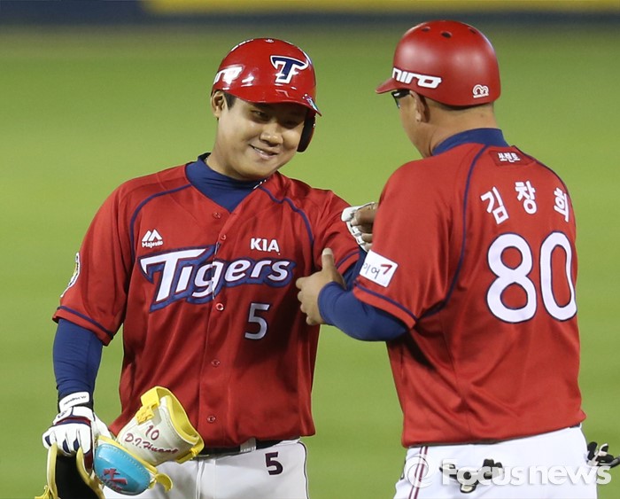 (서울=포커스뉴스) 17일 서울 잠실구장에서 열린 2016프로야구 KIA-두산 경기 9회초 1사 2루에서 KIA 대타 황대인이 좌익수 왼쪽으로 빠지는 1타점 2루타를 치고 김창희 코치의 축하를 받고 있다.