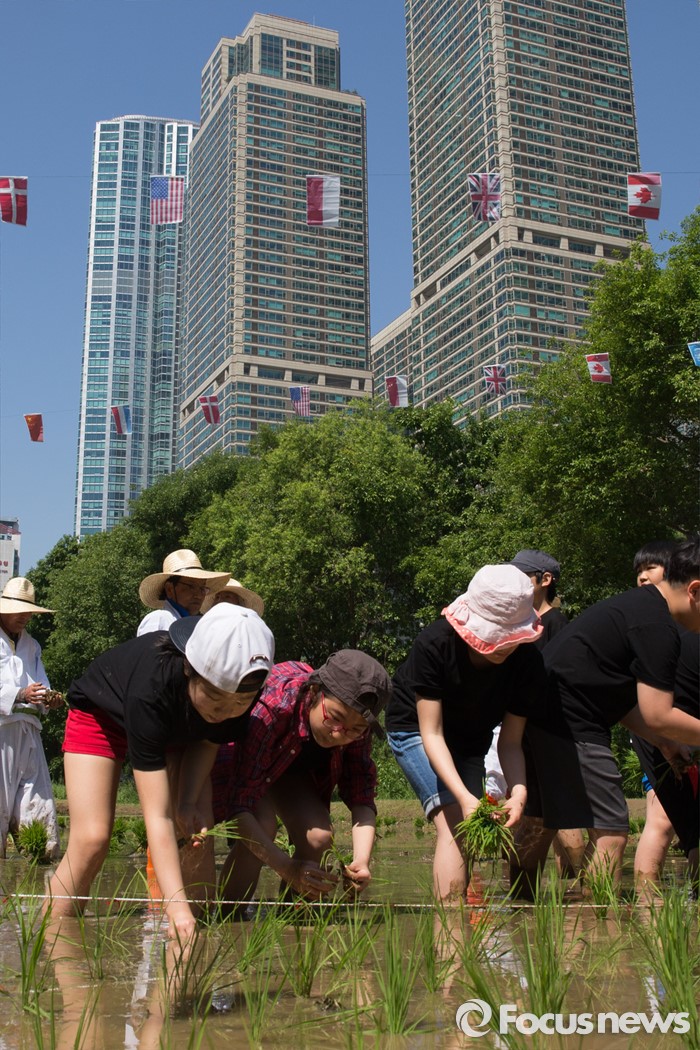 (서울=포커스뉴스) 18일 오전 서울 강남구 양재천 영동4교 인근 벼농사학습장에서 열린 전통 모내기 체험 행사에 참가한 주민들과 어린이들이 모내기를 하고 있다.