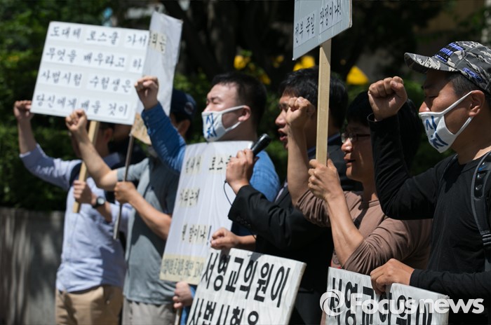 (서울=포커스뉴스) 18일 오전 서울 여의도 더불어민주당사 앞에서 사법시험 존치를 위한 고시생모임이 사시존치 법안의 법제사법위원회 전체회의 상정을 가로막은 더불어민주당 규탄시위를 하고 있다.