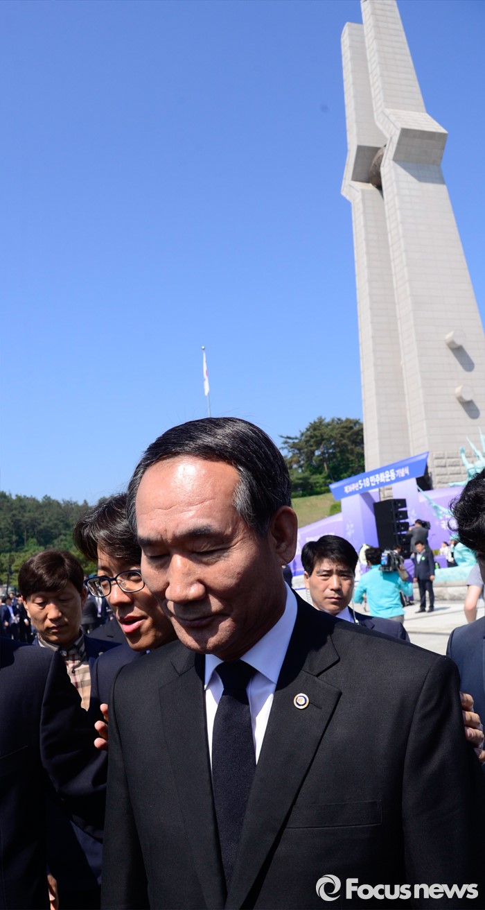(광주=포커스뉴스) 36주년 5·18민주화운동 기념식이 거행된 18일 오전 광주 북구 운정동 5·18민주묘지에서 행사장에 참석하려는 박승춘 보훈처장이 5월 유가족의 항의를 받고 기념식장을 떠나고 있다.