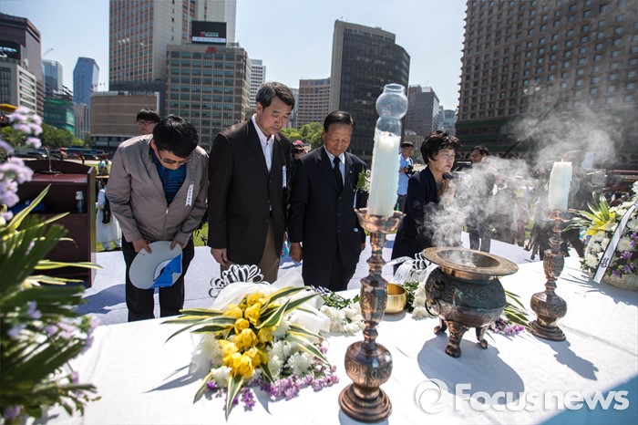 (서울=포커스뉴스) 18일 오전 서울 중구 서울시청 앞 광장에서 열린 5.18 민주화운동 기념식에 참석한 시민들이 단상에 올라 헌화 후 묵념을 하고 있다.