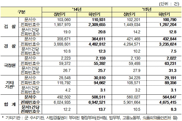 전년 동기 대비 전화번호 수 기준으로 검찰은 9175건(9만2745→8만3570건), 경찰은 244만8994건(404만6661→159만7667건), 기타기관은 875건(4121→3246건) 각각 감소, 국정원은 282건(981→1263) 증가했다.