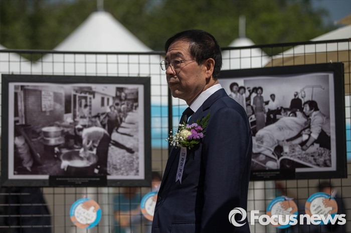 (서울=포커스뉴스) 18일 오전 서울 중구 서울시청 앞 광장에서 5.18 민주화운동 기념식이 열린 가운데 박원순 서울시장이 5.18 추모 사진전을 관람하고 있다.