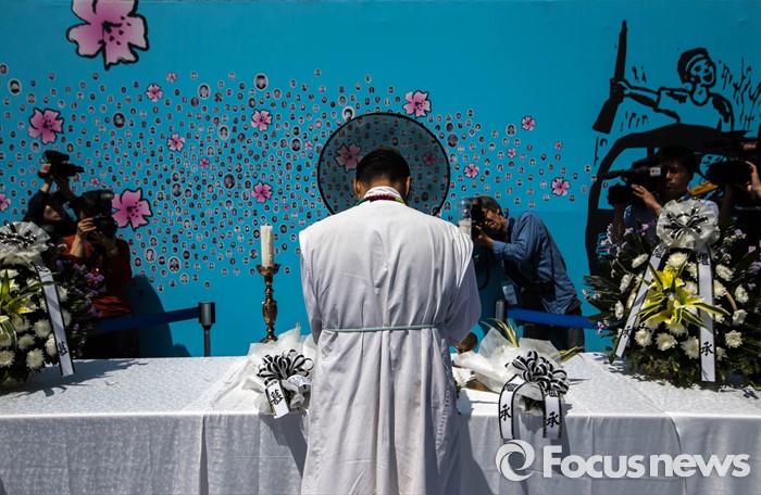(서울=포커스뉴스) 18일 오전 서울 중구 서울시청 앞 광장에서 열린 5.18 민주화운동 기념식에 참석한 한 시민이 단상에 올라 헌화 후 묵념을 하고 있다.
