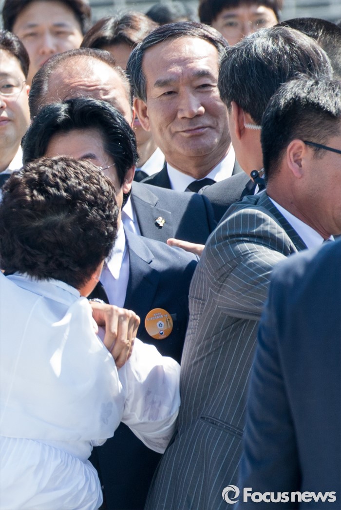 (광주=포커스뉴스) 36주년 5·18민주화운동 기념식이 거행된 18일 오전 광주 북구 운정동 5·18민주묘지에서 행사장에 참석하려는 박승춘 보훈처장을 5월 유가족이 제지하고 있다.