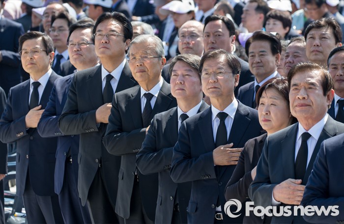 (광주=포커스뉴스) 36주년 5·18민주화운동 기념식이 거행된 18일 오전 광주 북구 운정동 5·18민주묘지에서 황교안 국무총리를 비롯한 여야 지도부와 참석자들이 국민의례를 고 있다.