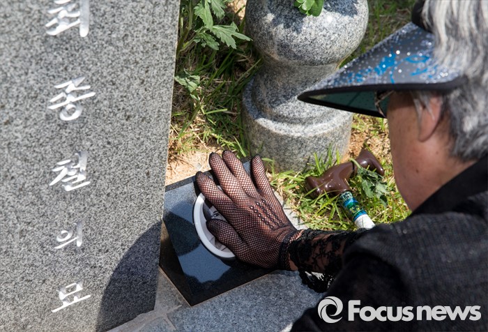 (광주=포커스뉴스) 36주년 5·18민주화운동 기념식이 거행된 18일 오전 광주 북구 운정동 5·18민주묘지에서 한 유가족이 묘비를 어루만지고 있다.