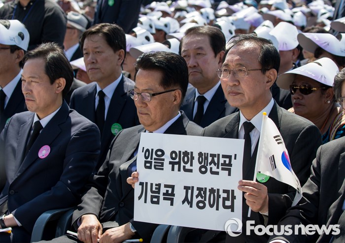 (광주=포커스뉴스) 36주년 5·18민주화운동 기념식이 거행된 18일 오전 광주 북구 운정동 5·18민주묘지에서 노회찬 정의당 원내대표가 '임을 위한 행진곡' 기념곡 지정을 촉구하는 손팻말을 들고 있다.