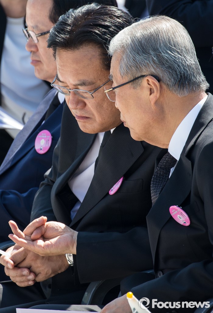 (광주=포커스뉴스) 36주년 5·18민주화운동 기념식이 거행된 18일 오전 광주 북구 운정동 5·18민주묘지에서 정진석(왼쪽) 새누리당 원내대표와 김종인 더불어민주당 비대위 대표가 대화하고 있다.