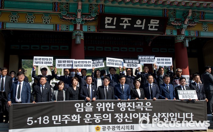 (광주=포커스뉴스) 36주년 5·18민주화운동 기념식이 거행된 18일 오전 광주 북구 운정동 5·18민주묘지 민주의문 앞에서 광주광역시의원들이 '임을 위한 행진곡' 기념곡 지정 및 제창을 요구하는 손팻말 및 펼침막을 들고 있다.