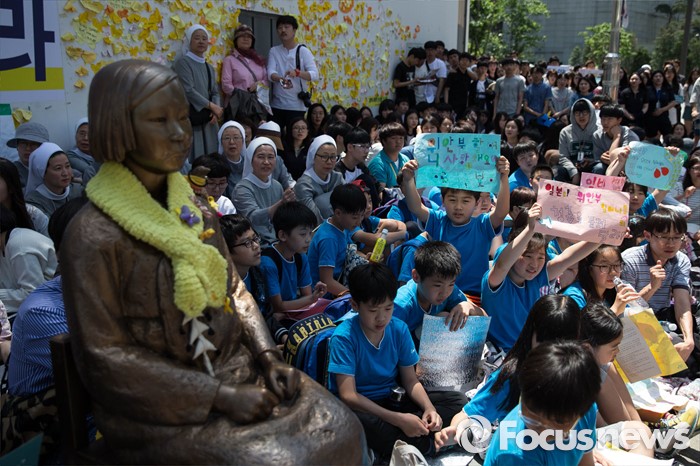 (서울=포커스뉴스) 18일 오후 서울 종로구 옛 일본대사관 앞에서 열린 '제1231차 일본군 위안부 문제해결을 위한 정기 수요시위'에 참석한 학생들이 일본의 사과를 촉구하는 손펫말을 들고 있다.