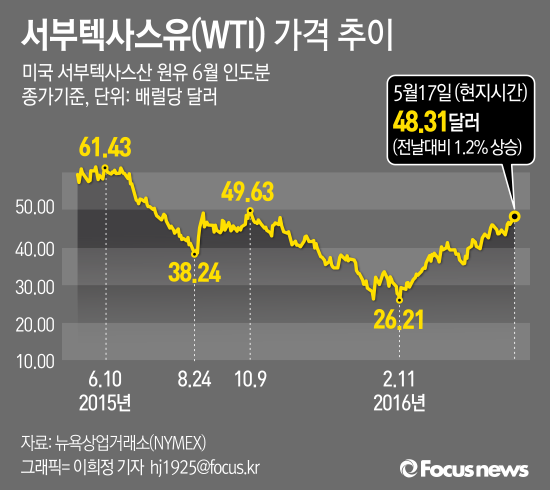 17일(현지시간) 뉴욕상업거래소에서 6월물 서부텍사스산 원유(WTI) 가격은 전일보다 59센트(1.2%) 뛴 48.31달러를 기록했다. 이는 지난 1월(26달러)와 비교했을 때 85.8% 상승한 것이고 지난해 10월 9일 이후 최고치다.