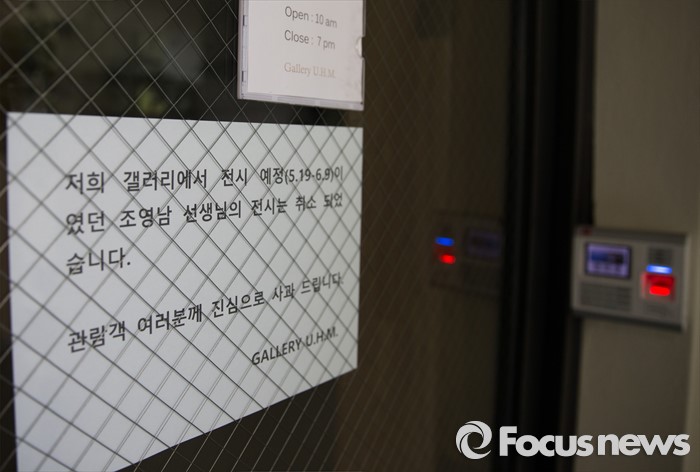 (서울=포커스뉴스) 18일 오후 서울 용산구 갤러리 U.H.M 입구에 조영남 전시회 취소 안내문이 붙어있다. 조영남은 무명화가 A씨가 지난 8년간 조영남의 그림 300여점을 대신 그렸다는 대작 의혹을 제기하면서 검찰의 압수수색을 받은 것으로 알려졌다.