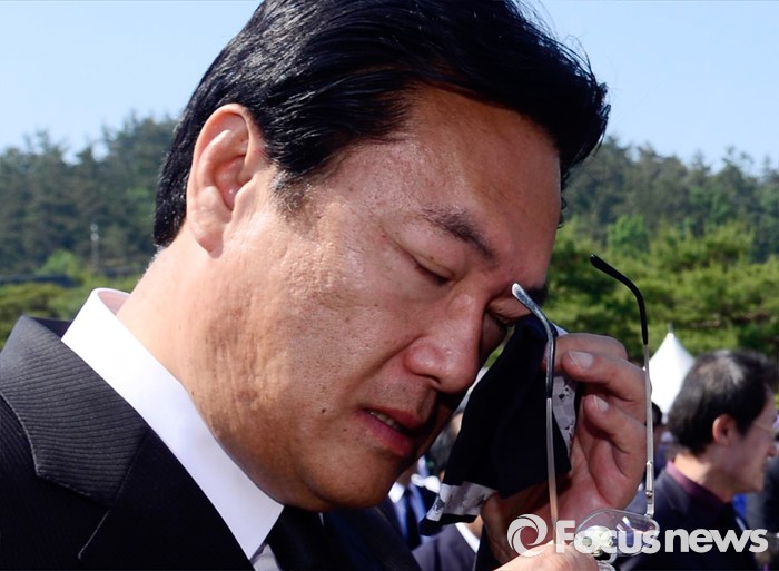 | △ 손수건으로 얼굴 훔치는 정진석 |