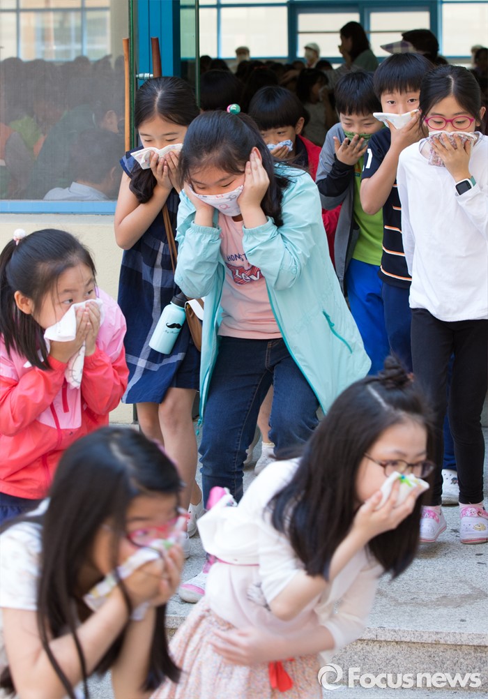 (공주=포커스뉴스) 18일 오후 충남 공주 신월초등학교에서 2016 재난대응 안전한국훈련 일환으로 실시된 현장대응 훈련에서 가스폭발로 인한 화재 발생을 가정, 학생들이 대피훈련을 하고 있다.