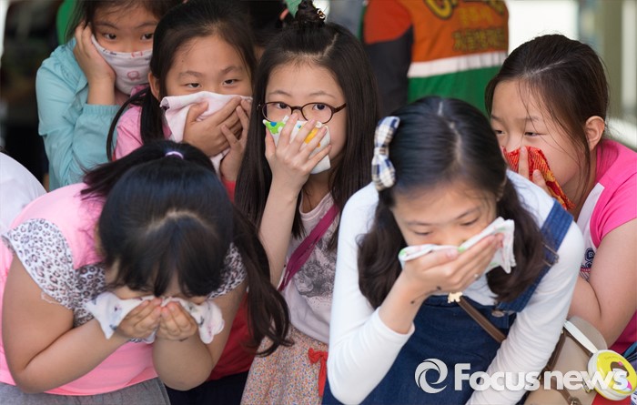 (공주=포커스뉴스) 18일 오후 충남 공주 신월초등학교에서 2016 재난대응 안전한국훈련 일환으로 실시된 현장대응 훈련에서 가스폭발로 인한 화재 발생을 가정, 학생들이 대피훈련을 하고 있다.