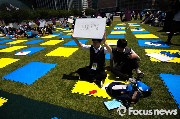 (서울=포커스뉴스) 18일 오후 서울 중구 서울시청 앞 광장에서 열린 '5.18 민주화운동 36주년 기념식 - 5.18 골든벨 행사'에 참석한 학생들이 퀴즈 문제를 풀고 있다.