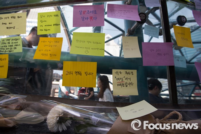 (서울=포커스뉴스) 18일 서울 서초구 강남역 10번출구에서 시민들이 '묻지마 살인' 피해자를 추모하고 있다.