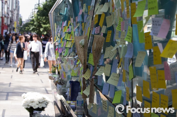 (서울=포커스뉴스) 18일 서울 서초구 강남역 10번출구에서 시민들이 '묻지마 살인' 피해자를 추모하고 있다.