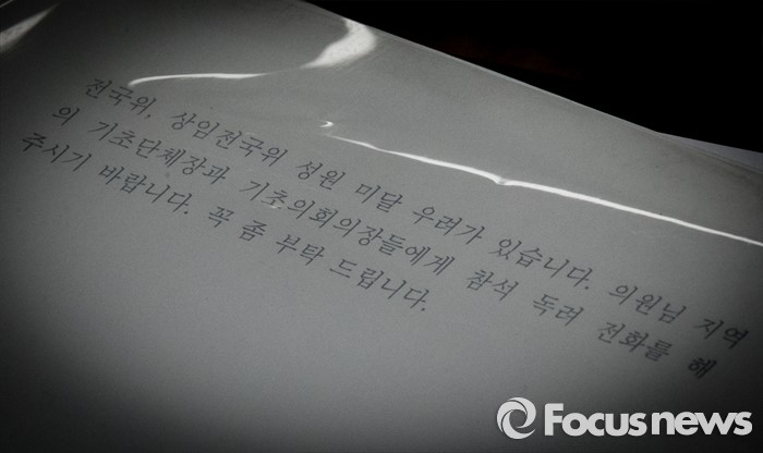(서울=포커스뉴스) 18일 오후 서울 여의도 국회 정진석 새누리당 원내대표실에 지난 17일 무산된 상임전국위원회 및 전국위원회 관련 보고 문서가 놓여 있다. 정 원내대표는 이날 오전 광주5·18민주화운동 기념식에 참석 후 KTX로 귀경 중 지역구인 충남 공주에서 하차 후 연락을 끊은 뒤 칩거에 들어갔다.