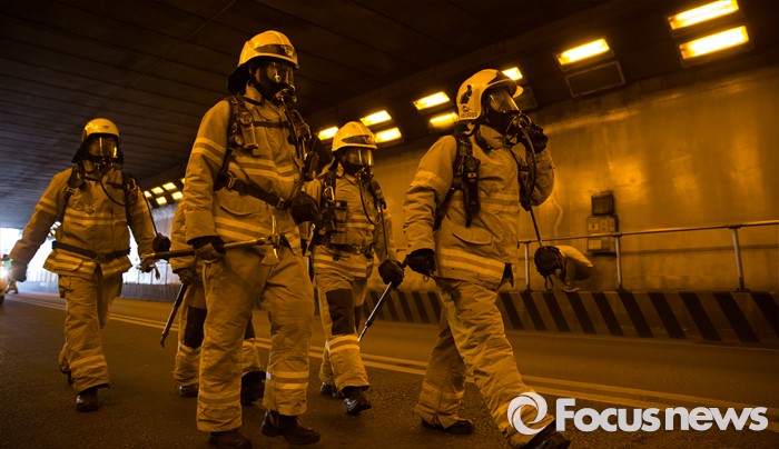 (서울=포커스뉴스) 18일 오후 서울 용산구 남산2호터널에서 재난대응 안전한국훈련-터널내 화재사고 대비 훈련이 진행되고 있다.