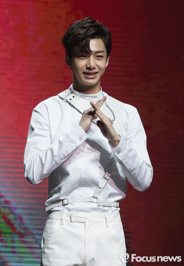 (서울=포커스뉴스) 18일 오후 서울 광진구 예스24 라이브홀에서 열린 아이돌그룹 몬스타엑스의 세번째 미니앨범 'THE CLEAN PART. 1 LOST' 발표 쇼케이스에 참석한 멤버 형원이 포토타임을 갖고 있다.