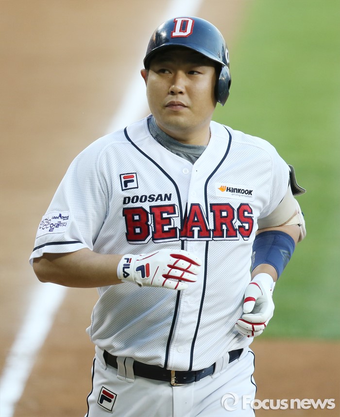 (서울=포커스뉴스) 18일 서울 잠실구장에서 열린 2016프로야구 KIA-두산 경기에서 2회말 두산 선두타자 양의지가 좌월 1점 홈런을 치고 홈인하고 있다.