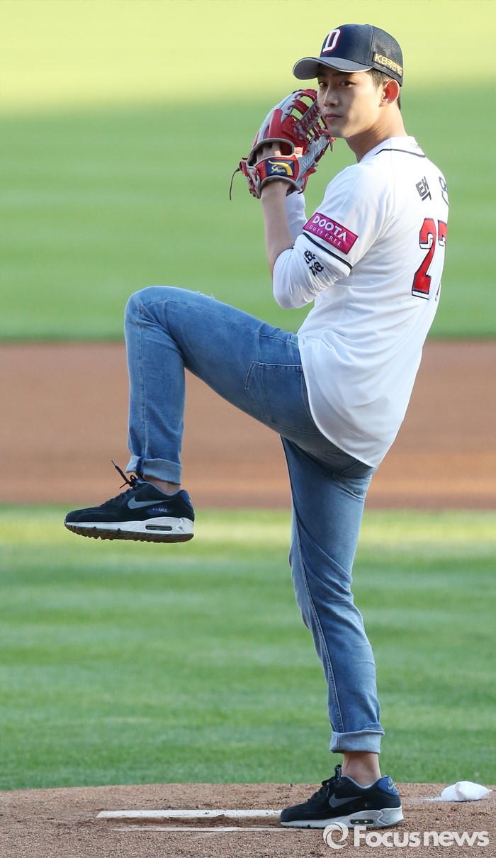 (서울=포커스뉴스) 18일 서울 잠실구장에서 열린 2016프로야구 KIA-두산 경기에 앞서 가수 겸 연기자인 시구자 옥택연이 와인드업을 하고 있다.
