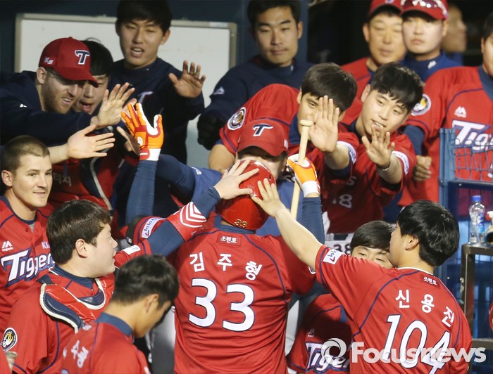 (서울=포커스뉴스) 18일 서울 잠실구장에서 열린 2016프로야구 KIA-두산 경기 5회초 무사 1루에서 KIA 김주형이 중월 2점 홈런을 치고 덕아웃에서 동료들의 열렬한 축하를 받고 있다.