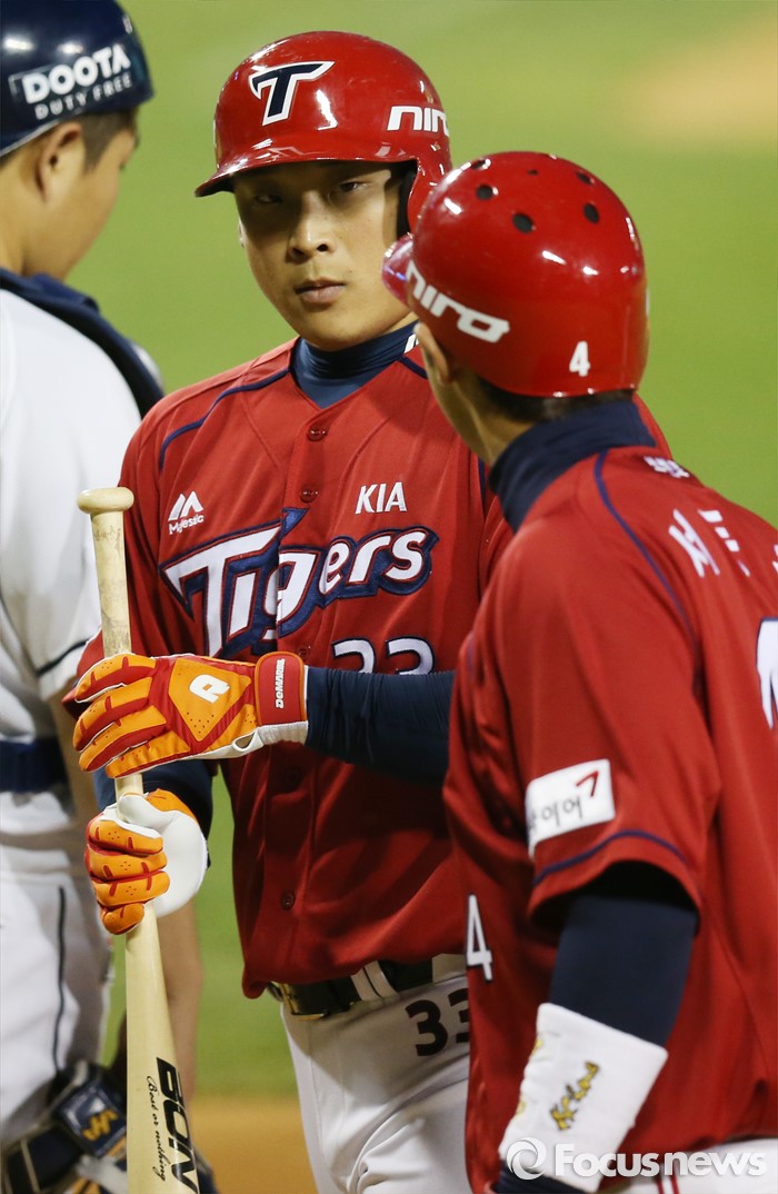 (서울=포커스뉴스) 18일 서울 잠실구장에서 열린 2016프로야구 KIA-두산 경기 5회초 무사 1루에서 KIA 김주형이 중월 2점 홈런을 치고 선행주자 서동욱의 환영을 받으며 홈인하고 있다.