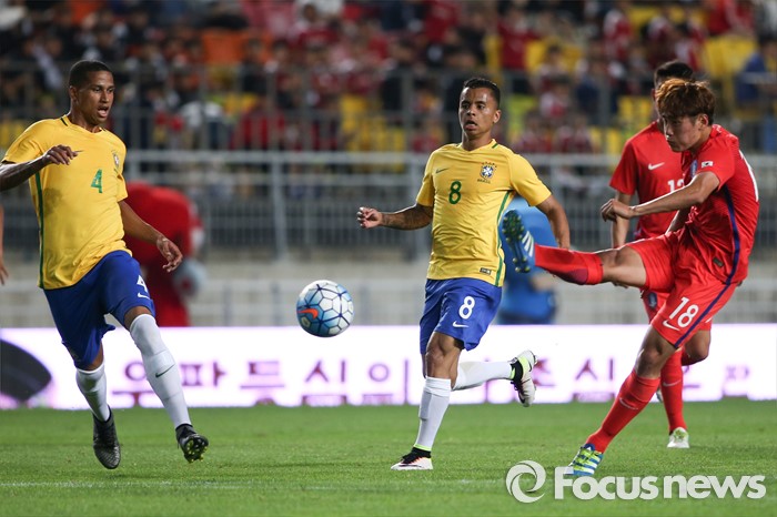(수원=포커스뉴스) 18일 오후 경기도 수원시 수원월드컵경기장에서 열린 2016 수원 JS컵 U-19 국제청소년축구대회 대한민국과 브라질의 경기에서 한찬희가 전반전 동점골을 넣고 있다.