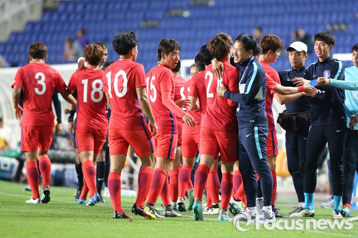 (수원=포커스뉴스) 18일 오후 경기도 수원시 수원월드컵경기장에서 열린 2016 수원 JS컵 U-19 국제청소년축구대회 대한민국과 브라질의 경기에서 한찬희가 전반전 동점골을 넣은 후 안익수 감독과 선수들이 함께 기뻐하고 있다.