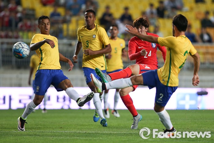 (수원=포커스뉴스) 18일 오후 경기도 수원시 수원월드컵경기장에서 열린 2016 수원 JS컵 U-19 국제청소년축구대회 대한민국과 브라질의 경기에서 박한빈이 슛을 하고 있다.