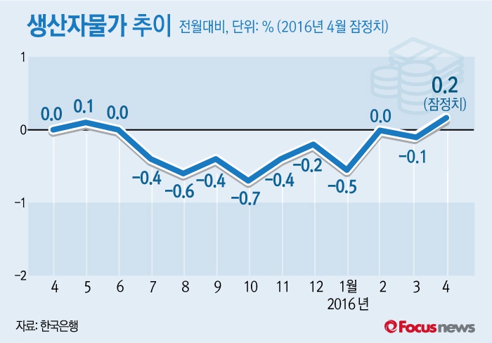 (서울=포커스뉴스)한국은행이 19일 공개한 '2016년 4월 생산자물가지수'를 보면 4월 생산자물가지수(2010년 100 기준)는 3월 대비 0.2% 상승한 98.60으로 집계됐다.