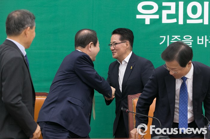 (서울=포커스뉴스) 19일 오전 서울 여의도 국회에서 열린 국민의당 의원총회에 참석한 박지원 원내대표가 의원들과 인사하고 있다. 오른쪽부터 천정배 공동대표, 박 원내대표, 박주선, 황주홍 의원.