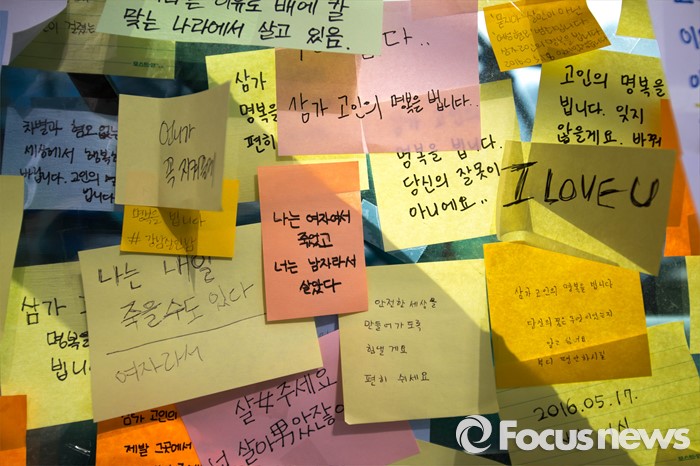 (서울=포커스뉴스) 19일 오전 서울 서초구 강남역 10번 출구에서 출근길 시민들이 '묻지마 살인' 피해자를 추모하고 있다.