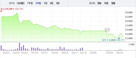 현대상선의 자율협약의 조건으로는 용선료 협상 타결이 포함돼있다. 이에 이 협상이 틀어질 경우 법정관리(기업회생절차)가 불가피한 상황이다.주가흐름<사진출처=네이버 캡쳐>