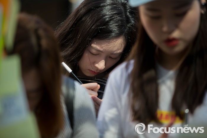 (서울=포커스뉴스) 19일 오전 서울 서초구 강남역 10번 출구에서 출근길 시민들이 '묻지마 살인' 피해자를 추모하고 있다.