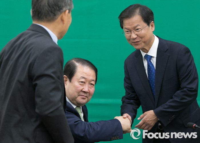 (서울=포커스뉴스) 19일 오전 서울 여의도 국회에서 열린 국민의당 의원총회에 참석한 천정배(오른쪽) 공동대표와 의원들이 인사하고 있다.