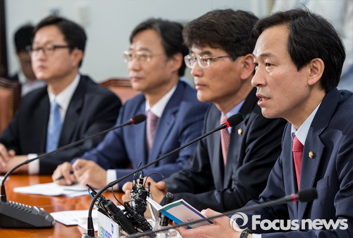(서울=포커스뉴스) 19일 오전 여의도 국회에서 열린 더불어민주당 원내대표단 회의에 참석한 우상호 신임 원내대표가 모두발언 하고 있다.