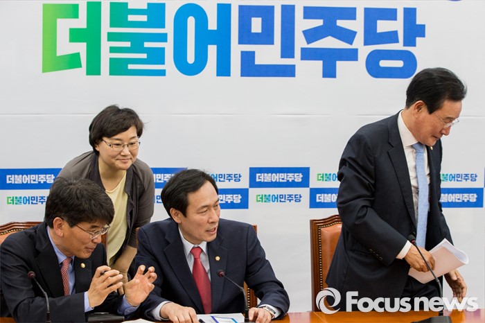 (서울=포커스뉴스) 19일 오전 여의도 국회에서 열린 더불어민주당 원내대표단 회의에 참석한 우상호 원내대표(왼쪽 세번째)가 원내대표단과 대화하고 있다.